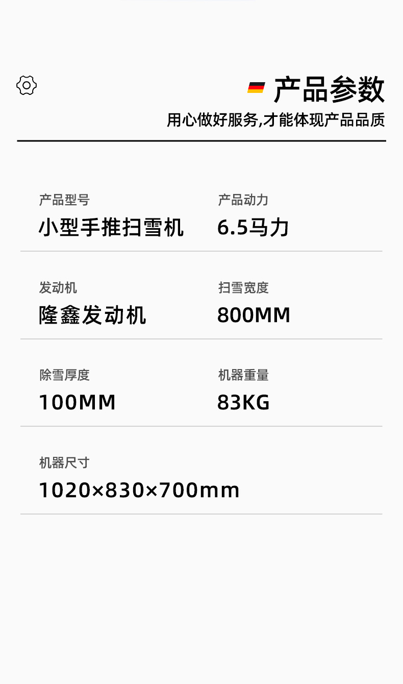 品牌:WACHTEL 型號(hào): 6.5P手推除雪機(jī) 發(fā)動(dòng)機(jī):隆鑫6.5馬力196CC 燃油類型:汽油/柴油 燃油/機(jī)油容量:3.6L/0.6L 除雪寬度:800 mm 除雪深度:150mm 工作時(shí)間:4h